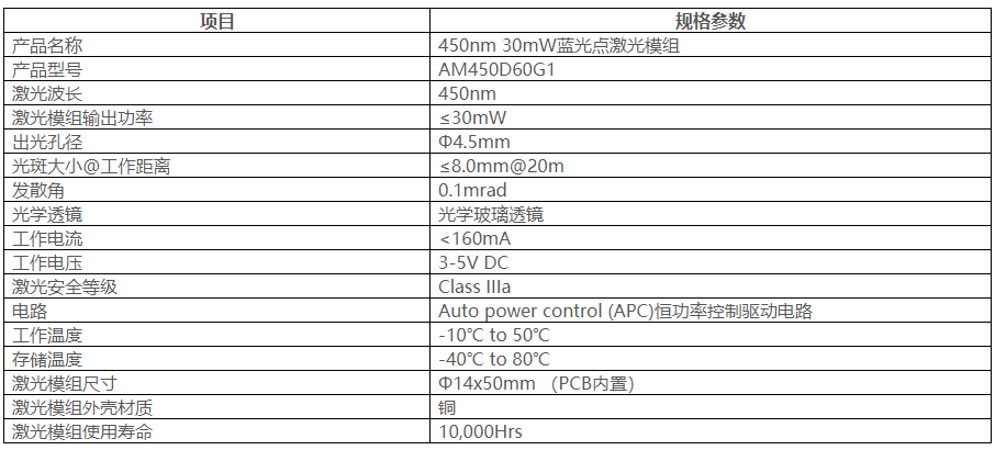 ※ 450nm 30mW藍光點激光模組的規(guī)格參數(shù):