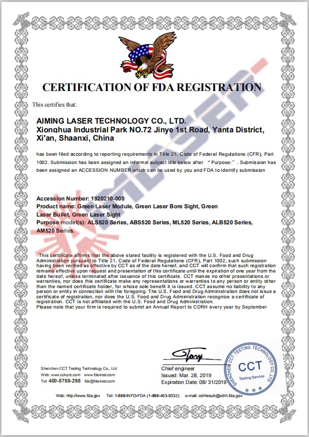 精耀光電(AimLaser)生產(chǎn)的綠光激光器通過了美國FDA認證。