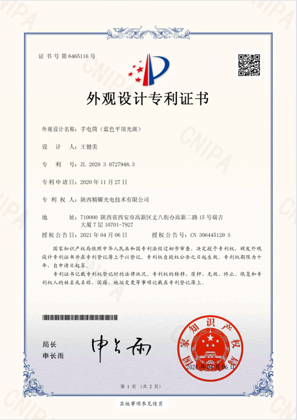 藍(lán)光手電外觀設(shè)計專利證書
